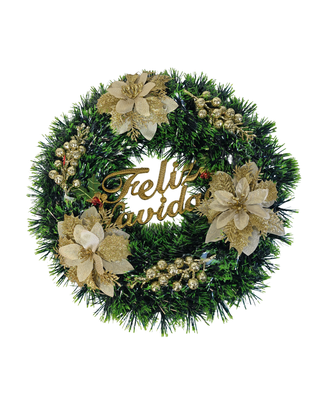Esta corona está decorada con grandes y deslumbrantes flores de pascua doradas y racimos de bayas escarchadas que capturan la luz de manera espectacular. El mensaje de "Feliz Navidad", en un brillante dorado, añade el toque final perfecto de calidez y alegría.